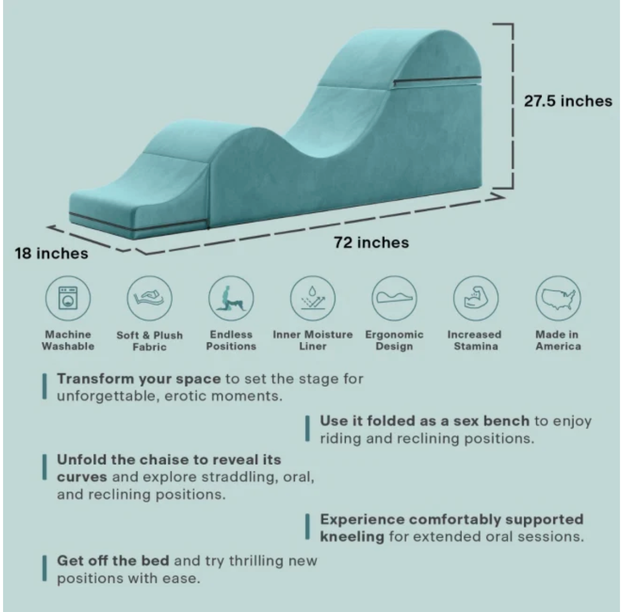 Use the Aria as a classic bench at the foot of the bed, or unfold it to reveal its flowing chaise silhouette. The graduated curves are great for propping up knees, hips, or back, helping you find comfortable angles for reading, relaxing, watching TV, stretching, or close connection with a partner.