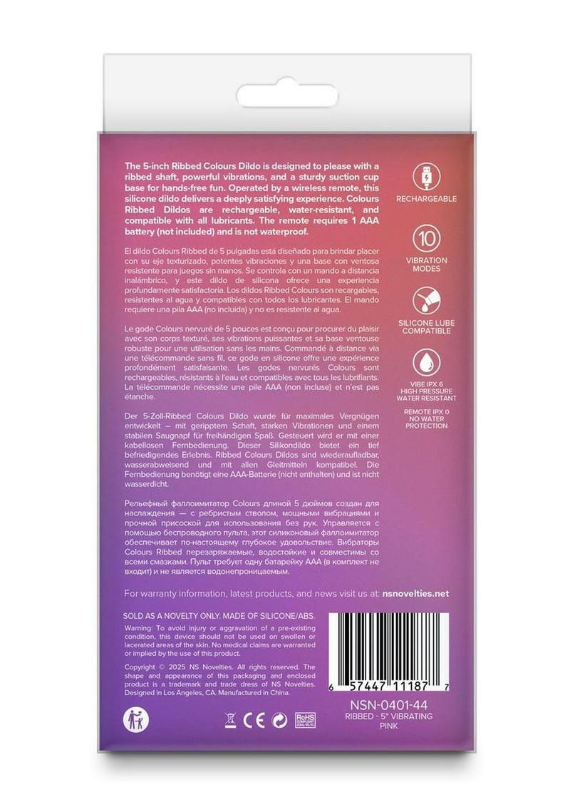 The 5-inch Ribbed Colours Vibrating Dildo is designed to please with a ribbed shaft, powerful vibrations, and a sturdy suction cup base for hands-free fun. Operated by a wireless remote, this silicone dildo delivers a deeply satisfying experience. Colours Ribbed Dildos are rechargeable, water-resistant (IPX 6), and compatible with all lubricants including silicone lubricant. The remote requires 1 AAA battery (not included) and is not waterproof. The remote control operates within 30 feet of the product.