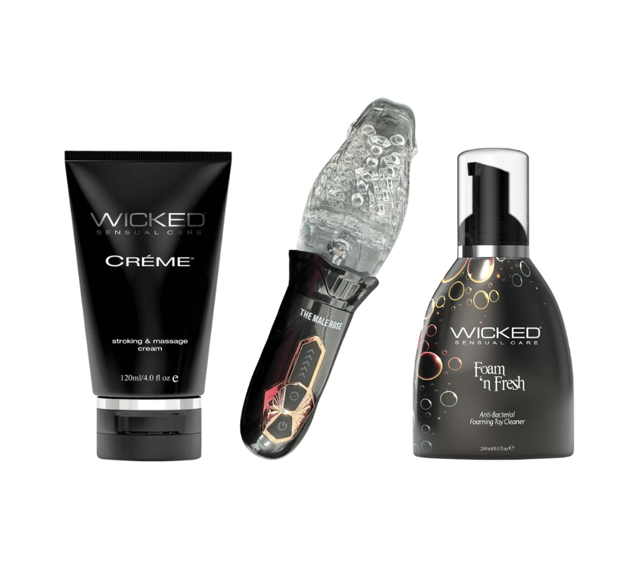 Upgrade personal care and pleasure with the Male Rose Experience Bundle, featuring The Male Rose Rechargeable Rotating Masturbator, Wicked Crème Stroking & Massage Cream, and Wicked Foam N' Fresh Anti-Bacterial Foaming Toy Cleaner.