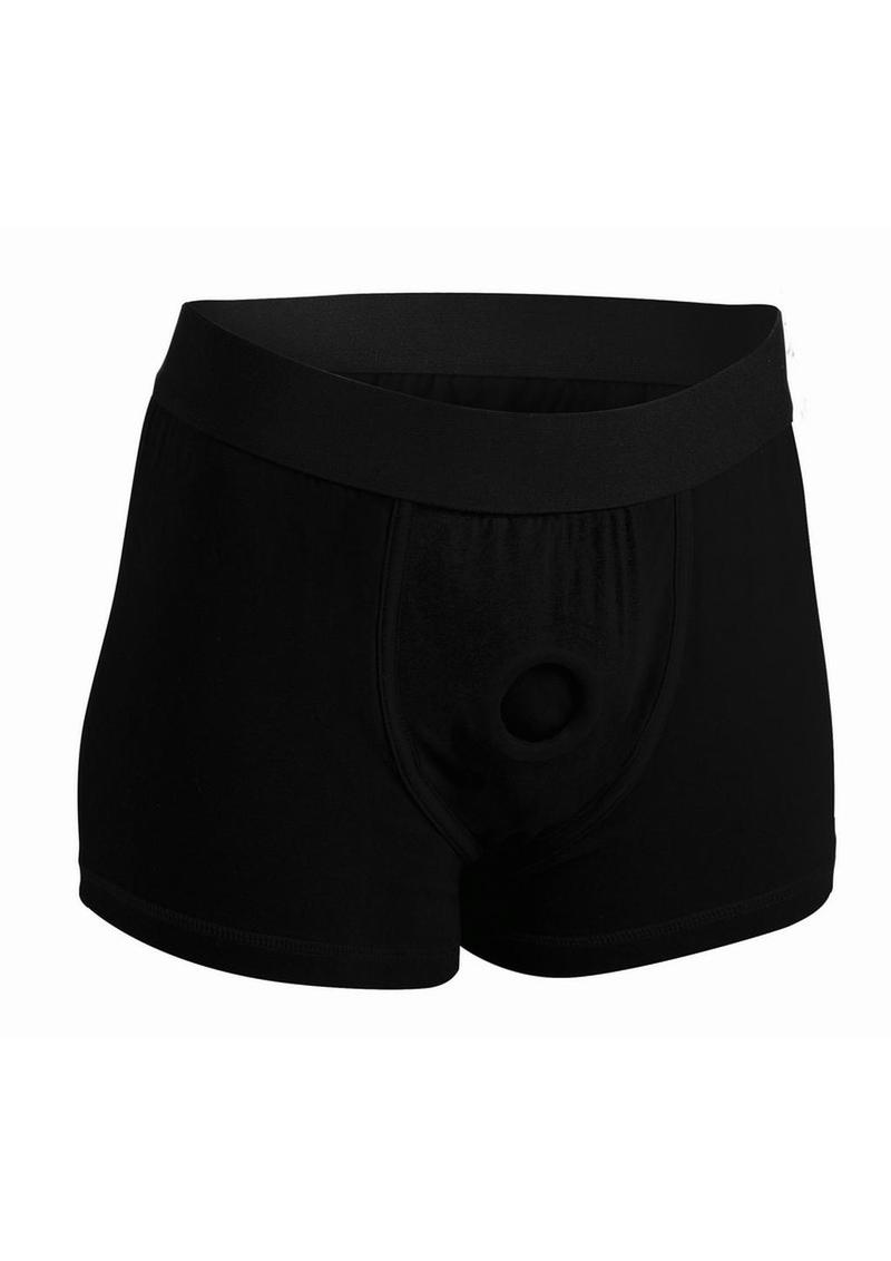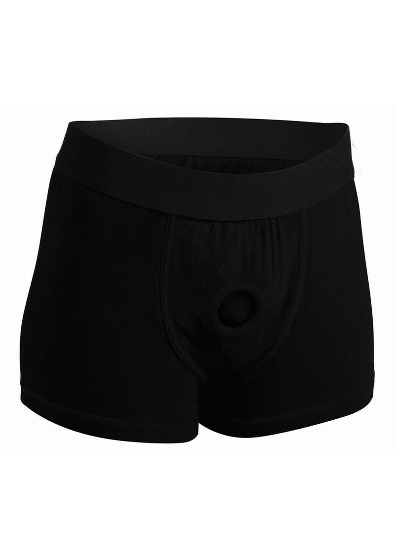 Feel more comfortable and stylish than ever before when you strap on your favorite dildo. This boxer brief style harness feels just like underwear, with an O-ring that stretches to accommodate most dildo sizes. You can even wear these cotton shorts out under your clothing, or stuff them with your favorite packer. This harness is excellent for extended wear. The supportive elastic waistband will carry the weight of your dong and you will be allowed greater mobility and position versatility. This harness is recommended for use with dildos that have a flat base that is 1.75 inches or wider. Machine washable.